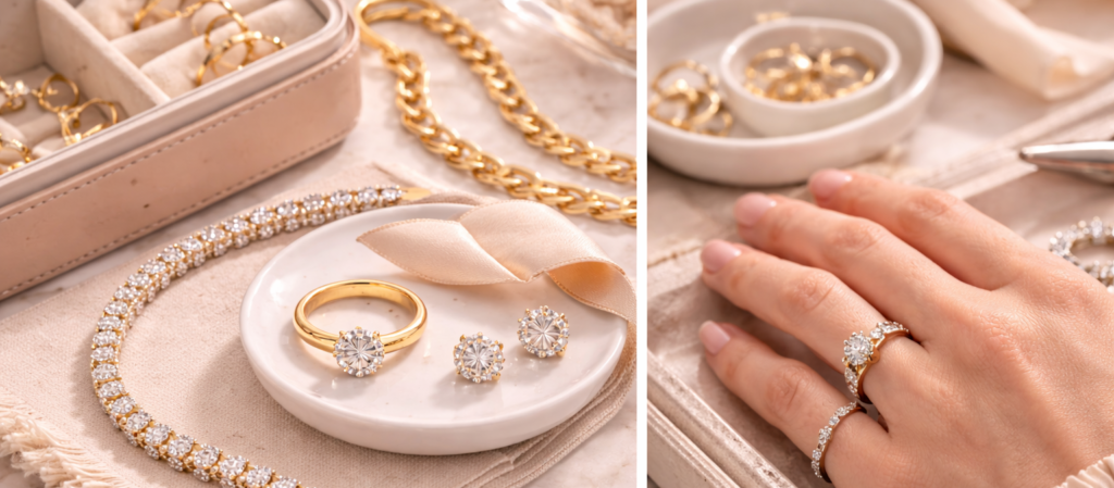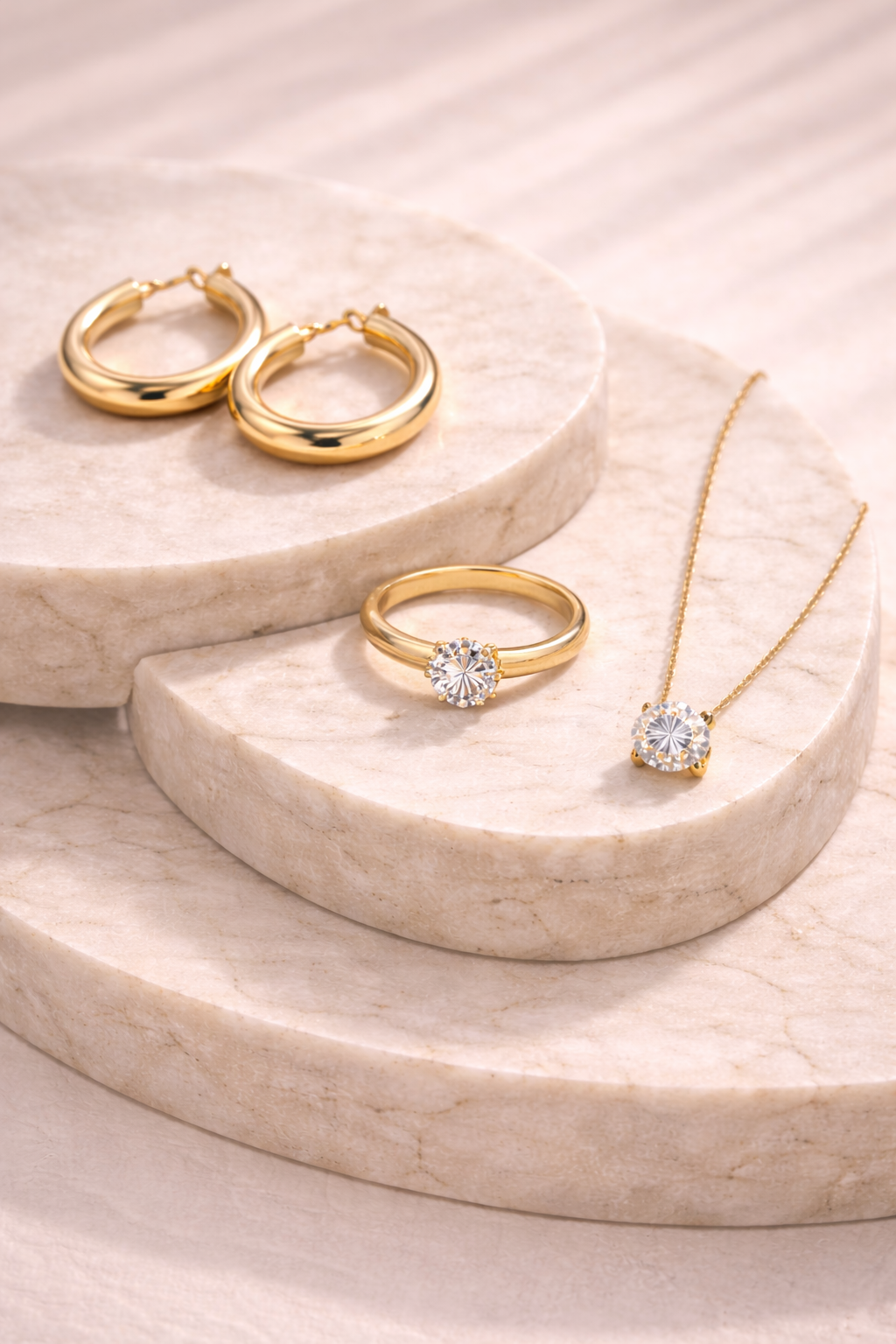 - Joias em ouro (alianças, anéis, brincos, correntes, pulseiras e pingentes)